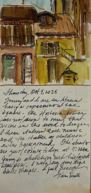 The week begins with Karen demonstrating sketching in Sharpie on paper, enhanced with watercolor washes. As the days unfold, she’ll guide you in developing those initial sketches into expressive small paintings on canvas boards. Through daily demos and personalized instruction, you’ll explore how to build compelling compositions, simplify color theory, and infuse your travel sketches and paintings with your own unique voice.