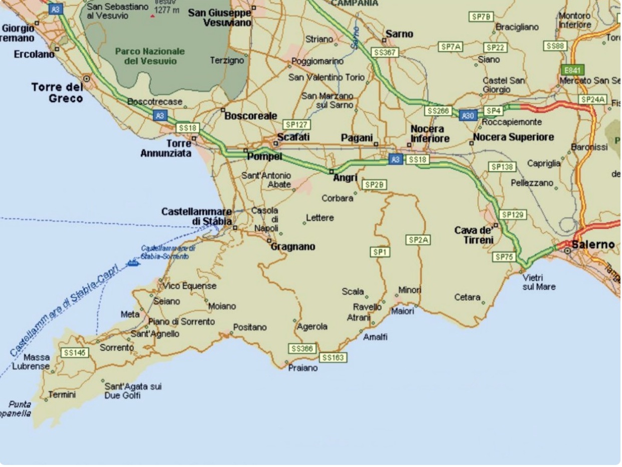 The Costiera Amalfitana in Italian is more informally known by most Americans as simply "Amalfi". The peninsula, across from the metropolis of Naples and under the shadow of the volcano Vesuvius, consists of Sorrento, Amalfi, Positano, Ravello, and Capri, among many other small towns and villages.