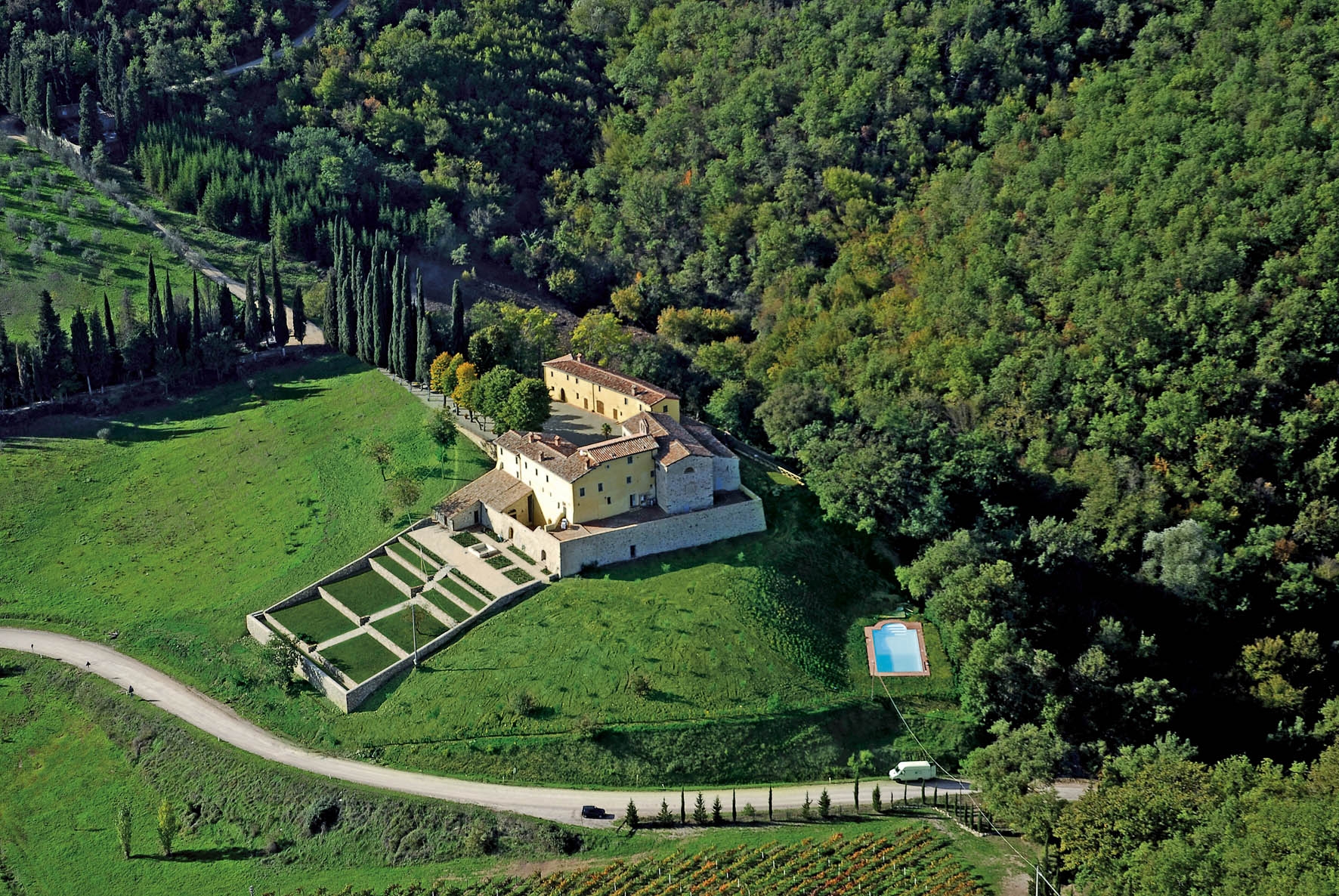 -- San Fedele is a restored 12th century monastery floating in the Chianti hills --