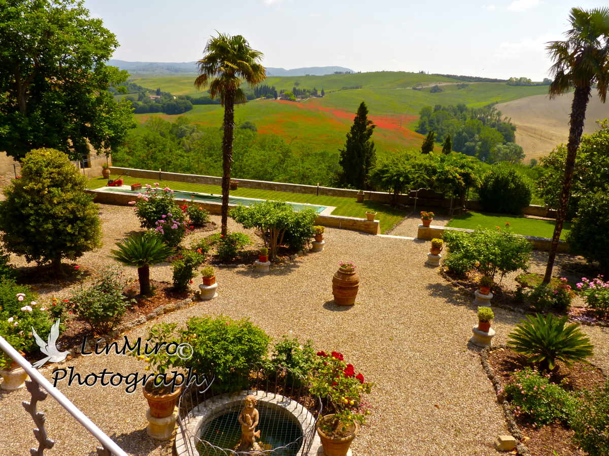 The Grounds: the setting is extraordinary, overlooking the valley towards the Brunello wine country. There is a formal garden with a pool, lounge chairs, a shade arbor, and plenty of seating for outdoor meals. The Villa is an easy walk through the facing castle (now the museum of truffles) to the quiet village of San Giovanni d’Asso.